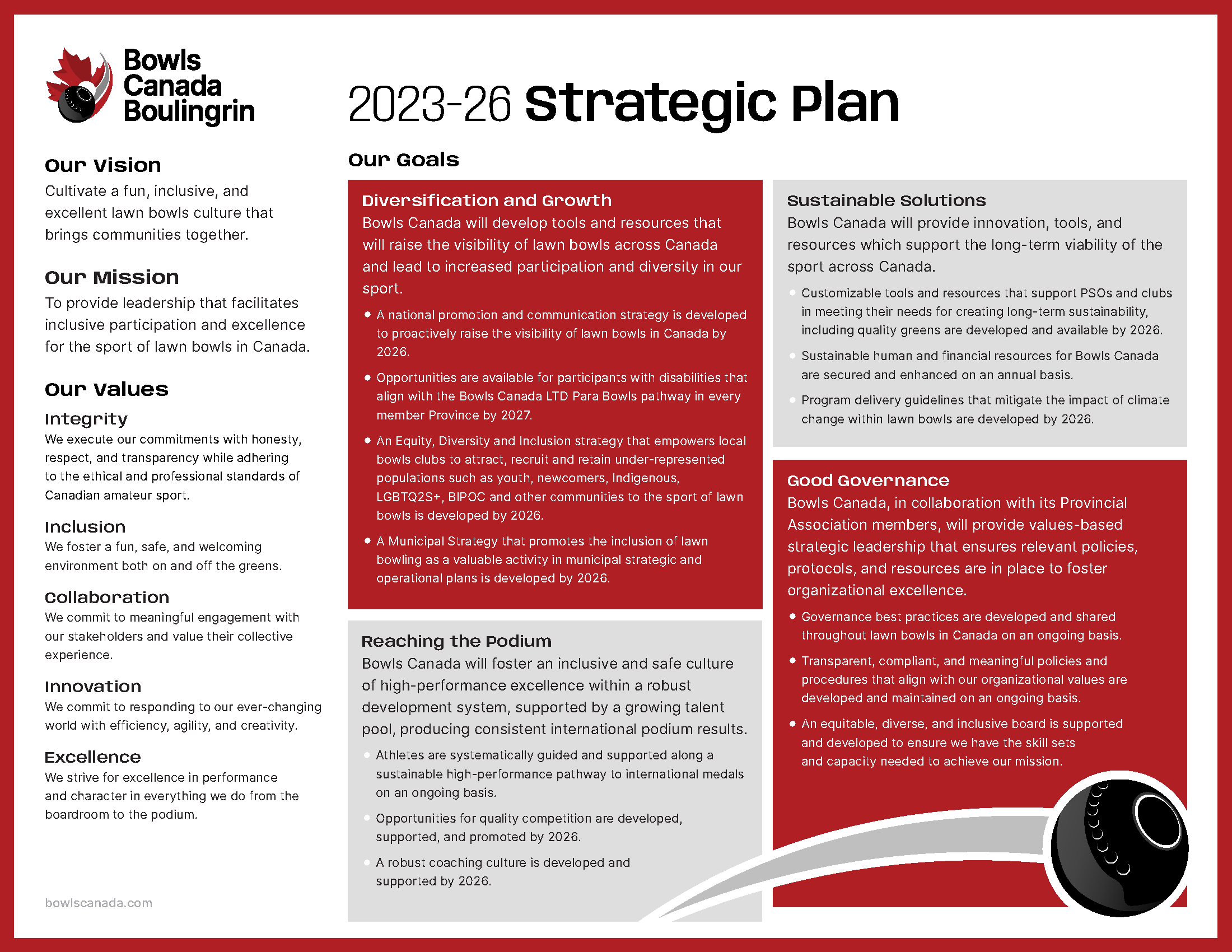The Bowls Canada vision, mission, and values provide a foundation from which the Board can implement the strategic plan in a way that leverages the opportunities and minimizes the risks.