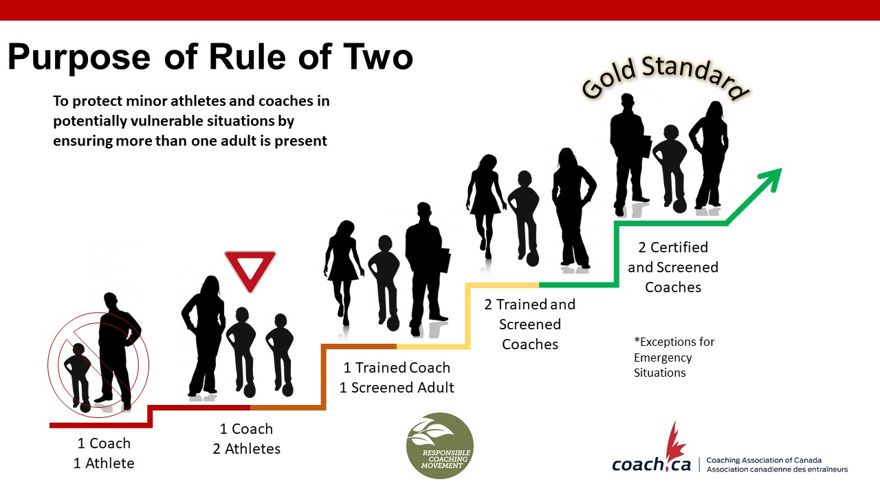 “The Rule of Two states that there will always be two screened and NCCP trained or certified coaches with an athlete, especially a minor athlete, when in a potentially vulnerable situation.” – Coaching Association of Canada.